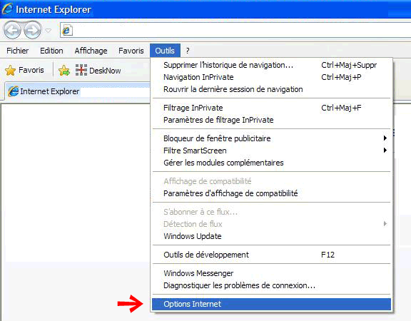 - 2. Choisissez « Outils » dans le menu général, puis « Options Internet ».