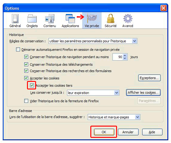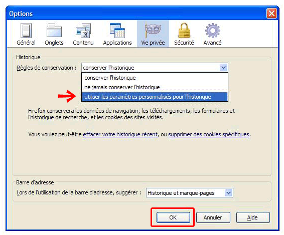 - 3. Choisissez l’onglet « Vie privée », déroulez le menu « Régles de conservation », puis cliquez sur « Utiliser les paramètres personnalisés pour l’historique ». Validez ce choix (« OK »).